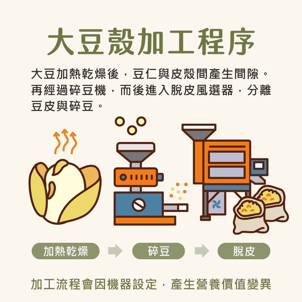 大豆經由加熱及乾燥,使得大豆的豆仁與豆皮間產生間隙。再經過碎豆機,經過處理的碎豆再進入脫皮風選器,風選過程中將豆皮與碎豆分開,大豆殼的營養價值相當不錯,但營養價值變異性也高,主要導因為碎豆及脫皮機器的設定而導致。