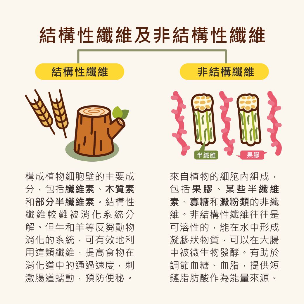 - 結構性纖維:如纖維素、木質素和半纖維素,是構成植物細胞壁的主要成分,提供植物組織的結構和強度,通常是不可溶性的,對於非反芻動物較難消化。