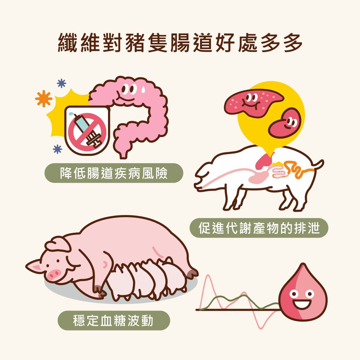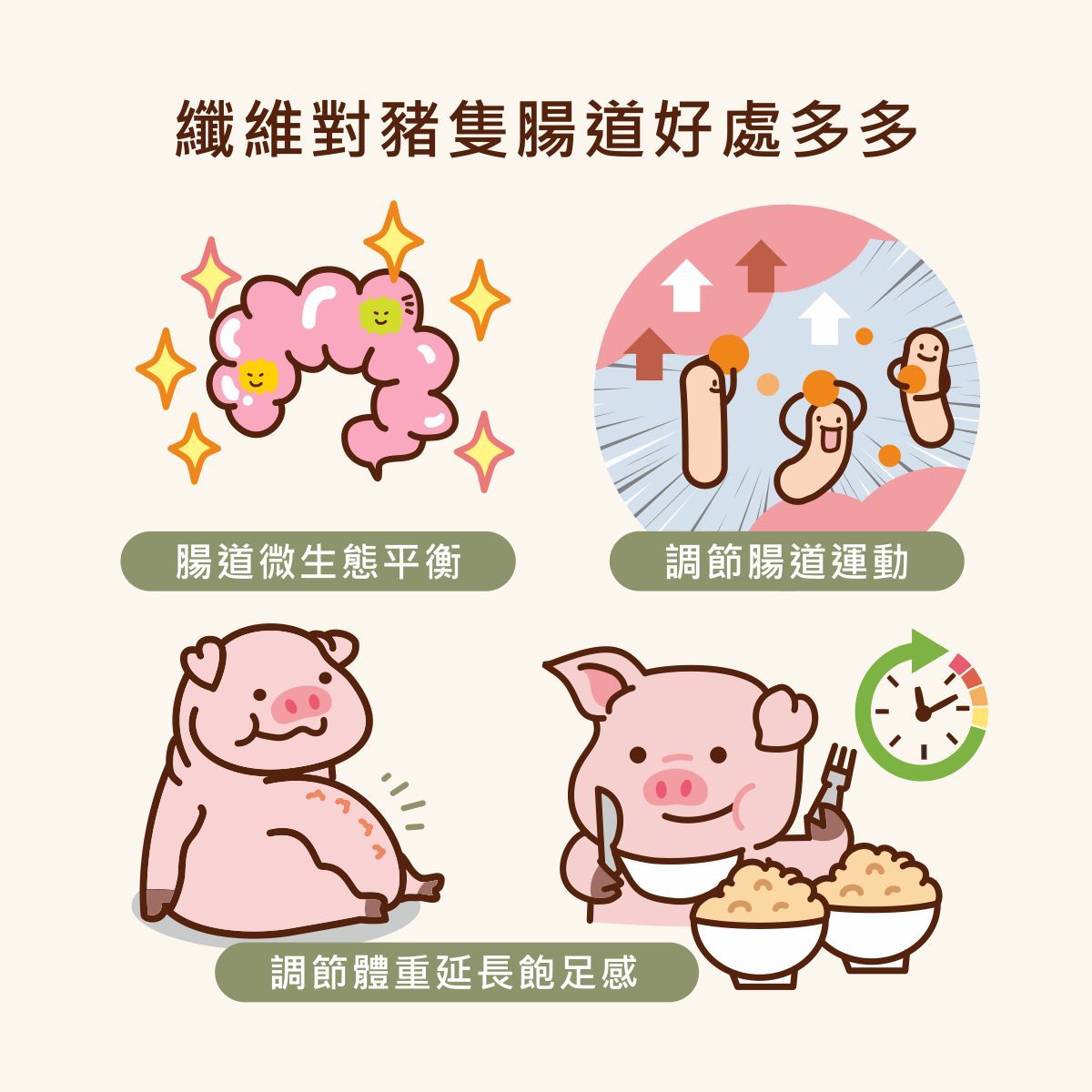 調節體重和提高飽腹感:纖維在腸道中膨脹,增加飽腹感,有助於控制豬隻的食量,進而控制體重。這對於避免肥胖及相關健康問題尤其重要。